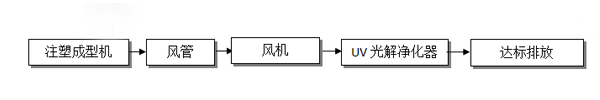 該公司在生產(chǎn)過(guò)程中有注塑成型工序,該工序產(chǎn)生了一定量非甲烷總烴有機(jī)廢氣。根據(jù)廠房提供的資料,我們工程師在參考了廣東省地方標(biāo)準(zhǔn)《大氣污染物排放標(biāo)準(zhǔn)》(DB44/27-2001),中華人民共和國(guó)《大氣污染物綜合排放標(biāo)準(zhǔn)》(GB16297-1996)后,根據(jù)以往工程經(jīng)驗(yàn),為該企業(yè)選擇了UV光解為主體處理工藝。